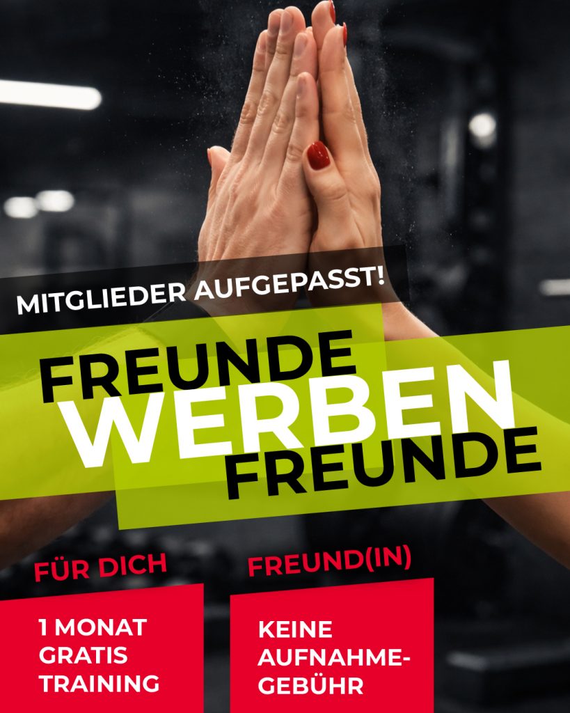 Wirb deine Freundinnen und Freunde für unser Studio – du bekommst dafür einen Monat Gratis-Training und dein(e) Freund(in) zahlt keine Aufnahmegebühr!